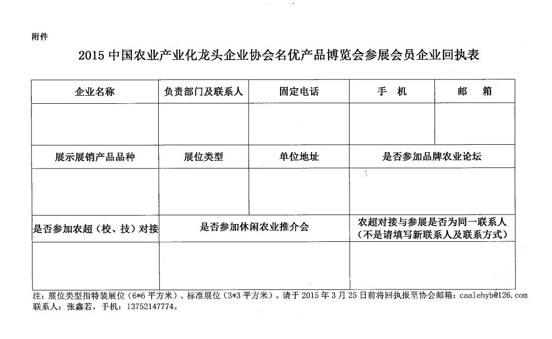 注:此次會(huì)議是針對中國農(nóng)業(yè)產(chǎn)業(yè)化龍頭企業(yè)協(xié)會(huì)(國家級)會(huì)員單位提供免費(fèi)展位,其他非本協(xié)會(huì)(國家級)會(huì)員須繳納一定費(fèi)用。
